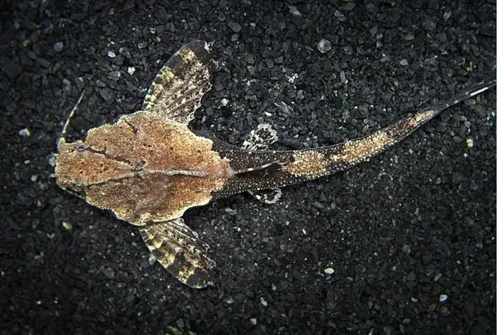 Possui um corpo achatado e camuflado, que o ajuda a se esconder no substrato.